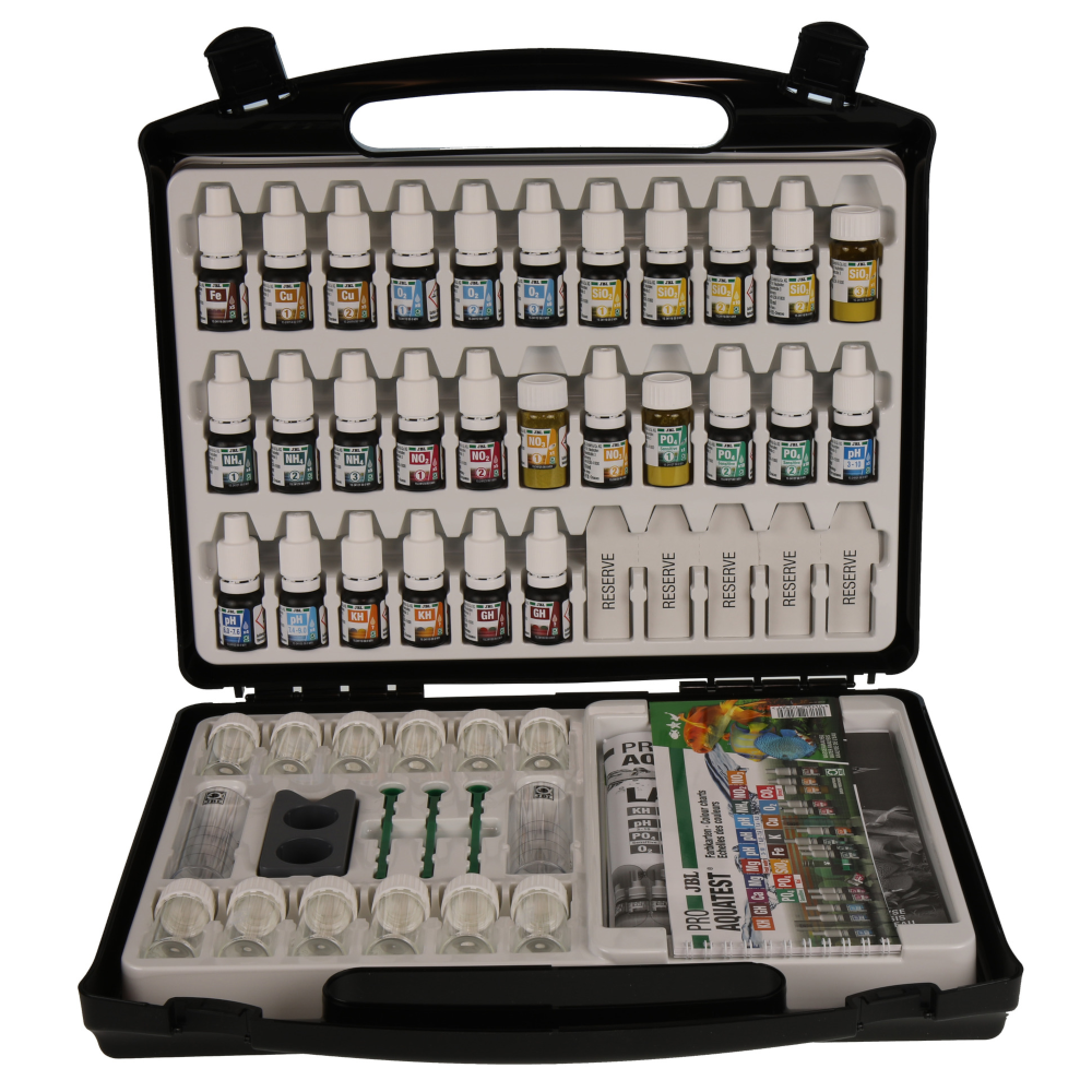 - salkussa on mukana yhteensä 13 erilaista testiä, 12 testilasia, kaksi ruiskua, kolme annostelulusikkaa, lämpömittari, vertailuteline, kaksi muovista kyvettiä, väritaulukkoja ja CO2 -taulukko, kuulakärkikynä, tulosvihko ja ohjeet